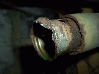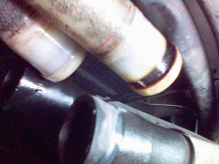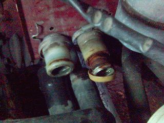 Erfahrungsgemäß sind die Wasserrohre nach vorne zum Kühler mit den Jahren auch schon etwas gealtert. Dazu kommt, das die Rohre einen Konstruktionsfehler haben, der sich gerne dramatisch und motorschädigend nachts auf einsamer Landstrasse im Regen mit quengelnden Kindern im Wagen äußert, sollte man die Gelegenheit nutzen, wenn der Tank sowieso draußen ist und die Rohre den Fühltest nicht bestanden haben, bzw. andere Zeichen zeigen, die ich gleich erläutere, die Rohre mit auszutauschen. Das Ganze ist bei ausgebautem Tank eine Kleinigkeit und gibt wieder Sicherheit für Jahre. Die Wasserrohre sind aus Kunststoff gefertigt und besitzen an beiden Enden eingepresste Metallhülsen. Diese Hülsen korrodieren, insbesondere dann, wenn nicht ausreichend Frostschutz im Wasser ist (auch nur kurzzeitig im langen Leben eines Bully). Die Korrosion führt dazu, das der Kunststoff reißt und die Metallhülse wandert langsam heraus. Dadurch verliert die Schelle, die den Schlauch auf dem Rohr fixiert, langsam die Vorspannung, wandert ab und irgendwann flutscht der Schlauch ganz ab und ehe man sich versieht, ist das Kühlwasser weg und der Motor Geschichte. Wenn man die Schläuche abzieht, dann sieht es wie auf den Bildern unten oder so ähnlich aus. Sicheres Zeichen für einen bevorstehenden Defekt sind leichter Wasserverlust an den Schellen und ein sichtbarer roter Ring auf den Rohren. Normalerweise sind diese roten Ringe Markierungen, bis wohin die Schläuche aufgeschoben werden müssen. Wie auf dem Bild erkennbar sind die Ringe schon dreckig, also ist der Wanderungsprozess der Metallhülsen schon länger im Gang. Das linke Rohr hat dagegen einen sauberen roten Ring, dort ist bis zur Demontage alles in Ordnung gewesen. Rohre werden grundsätzlich paarweise getauscht, da sie immer gleich alt sind. Im Regelfall ist das rechte der beiden Rohre betroffen, dort fließt das heiße Wasser vom Motor zum Kühler. Ein weiterer sicherer Indikator ist auch der Tasttest. Man tastet mit dem Finger zwischen Schelle und Rohrende durch den Schlauch, der tastbare Durchmesser muss gleich dem vor der Schelle in Richtung Rohr sein. Ist er das nicht, dann ist die Hülse schon herausgewandert. meist ist auch der Kunststoffwulst schon abgerissen und nicht mehr tastbar. Hier sieht man die Rohrenden im Motorraum, die rechte Hülse ist schon fast vollständig herausgewandert. Sie wird auch am stärksten beansprucht (Zulauf zum Kühler vom Motor, direkt nach dem Motor)